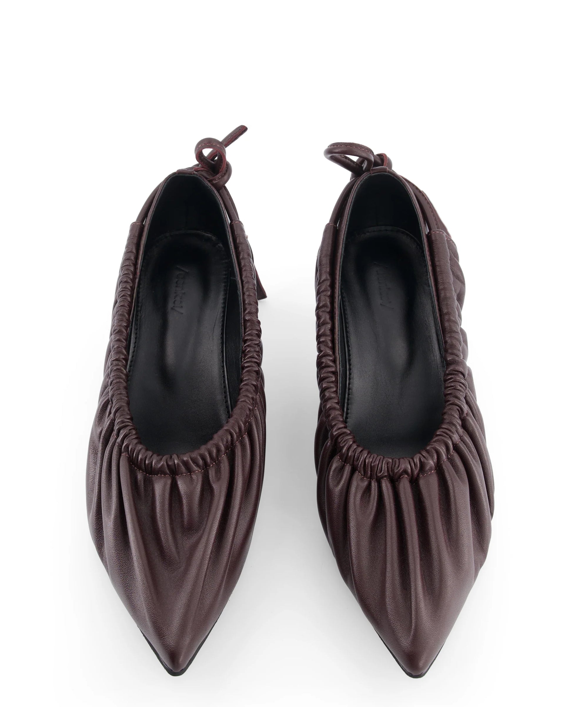 These elegant black heels feature a unique ruched leather design along the upper, giving them a refined, gathered look. A pointed toe and sculpted heel add sophistication, while the delicate ankle tie ensures a secure fit. With a comfortable insole and manageable heel height, these heels are perfect for all-day wear.