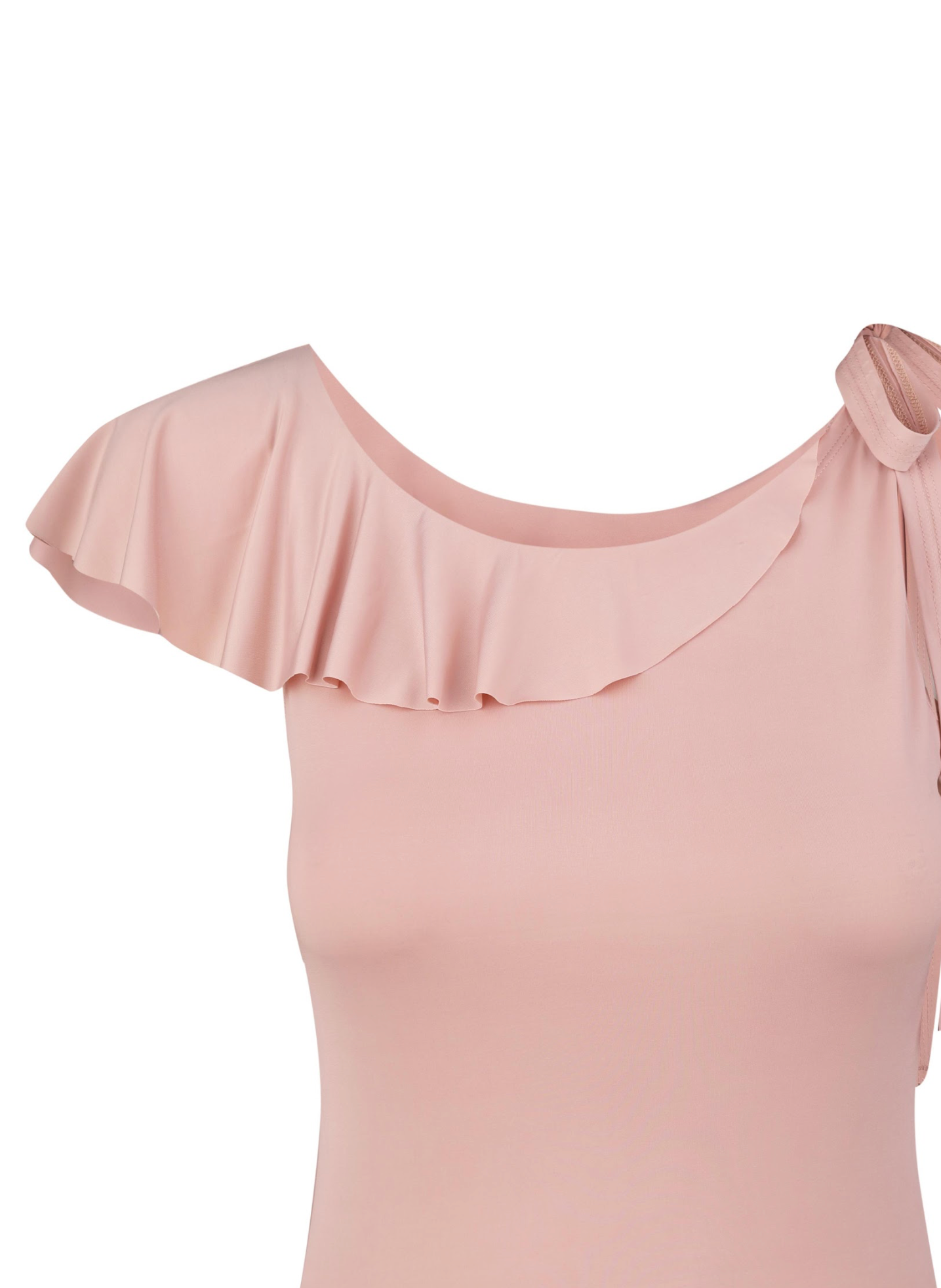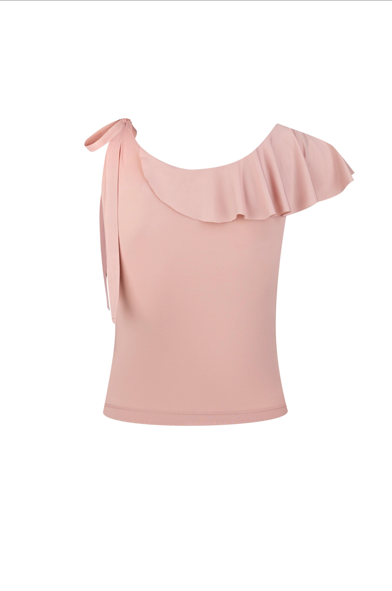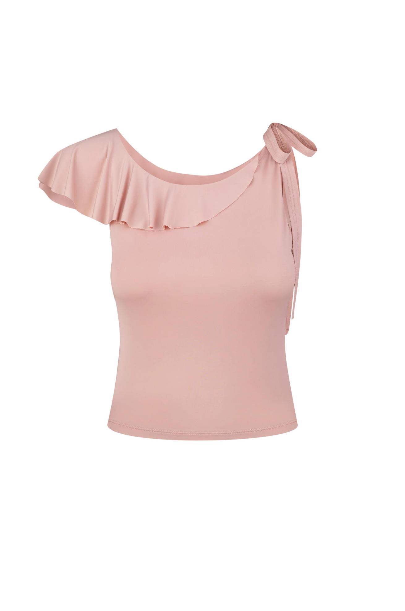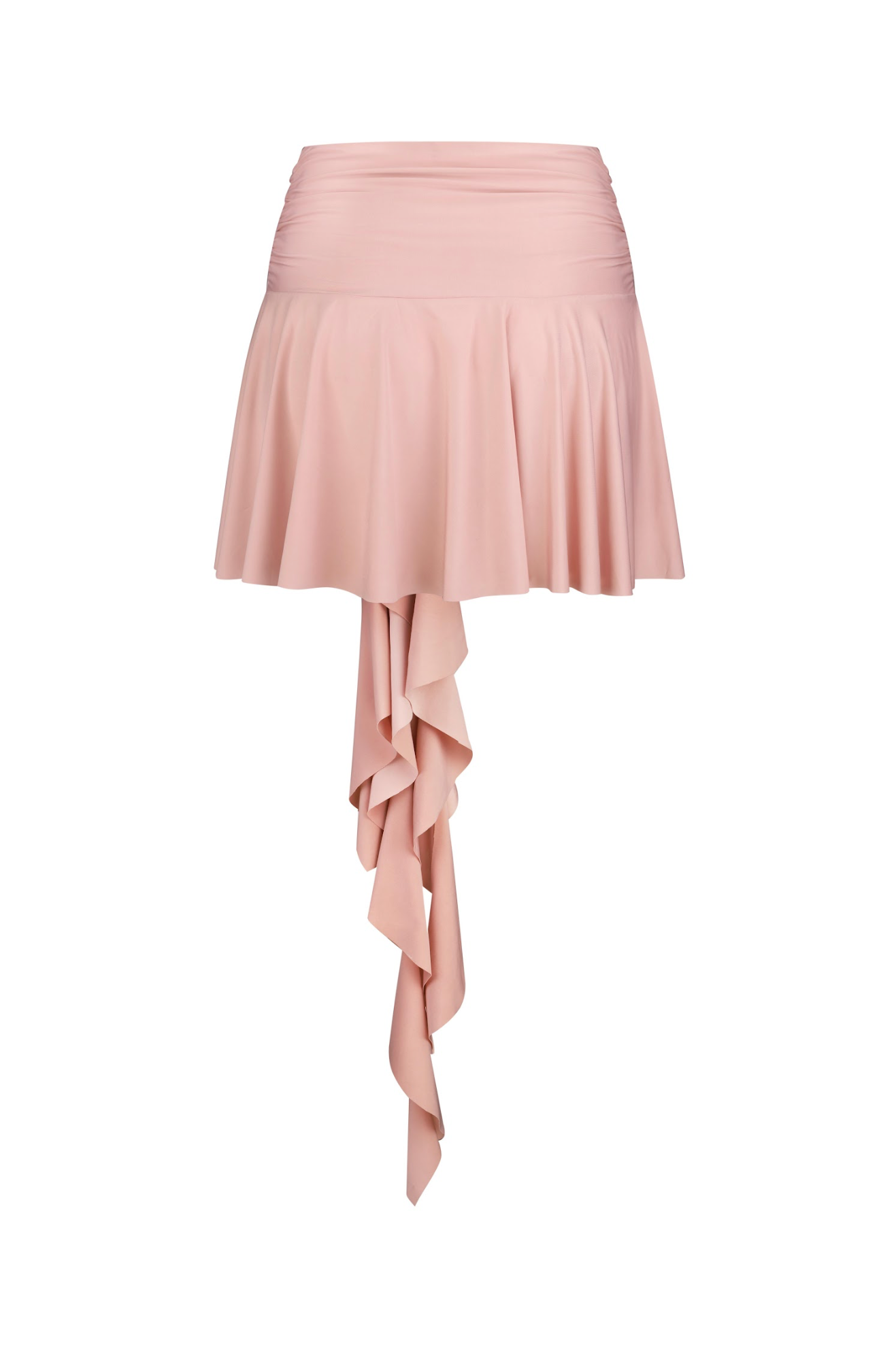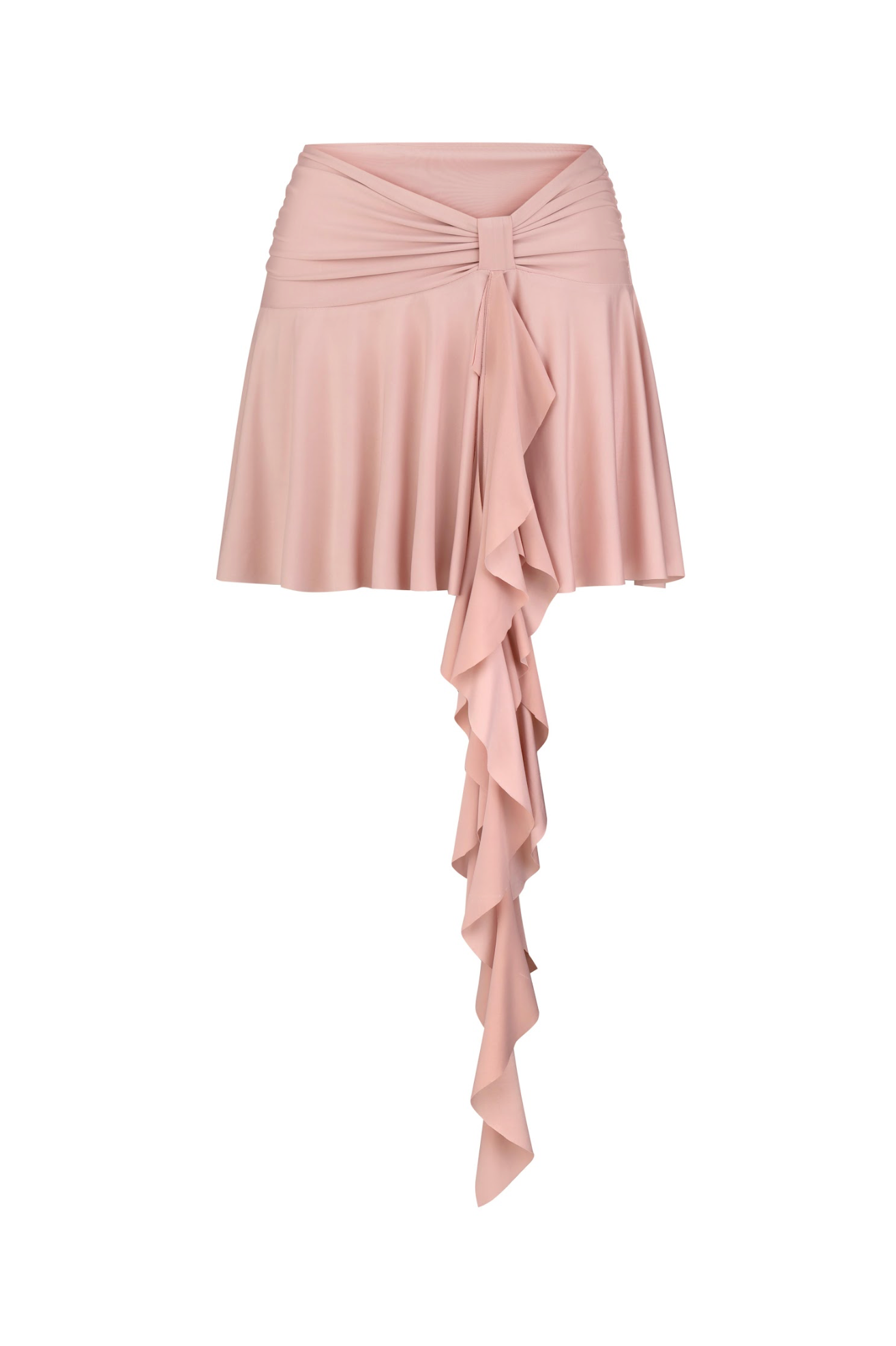 The structured crop top features delicate lace trim and adjustable straps for a customized fit. The high-waisted mini-skirt flows gracefully with a soft pleated finish and is adorned with an intricate front decoration, including delicate fabric embellishments.