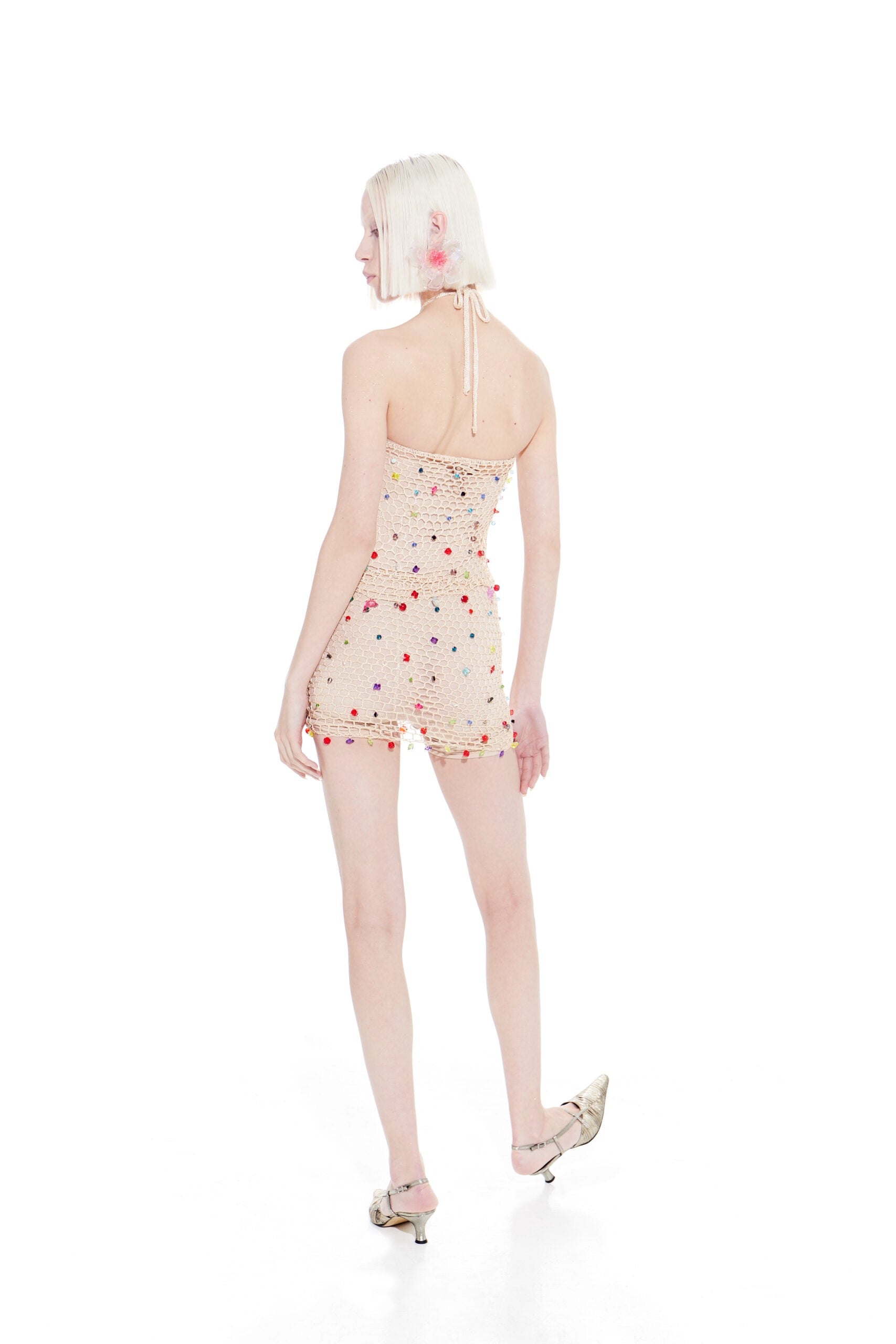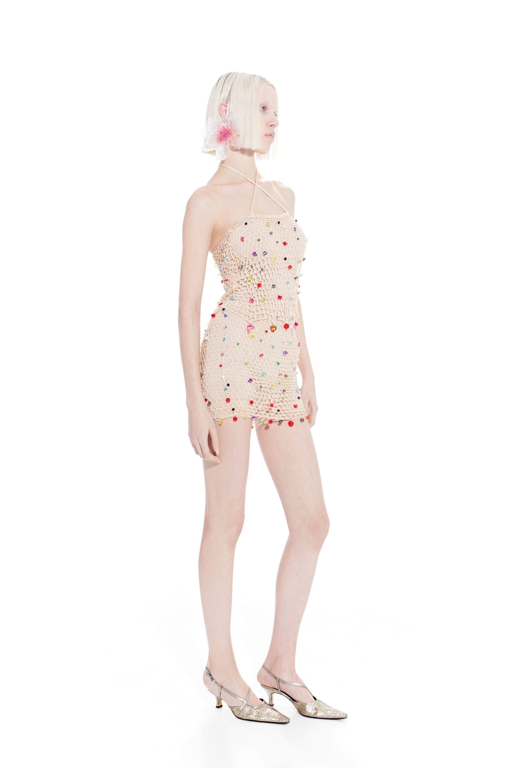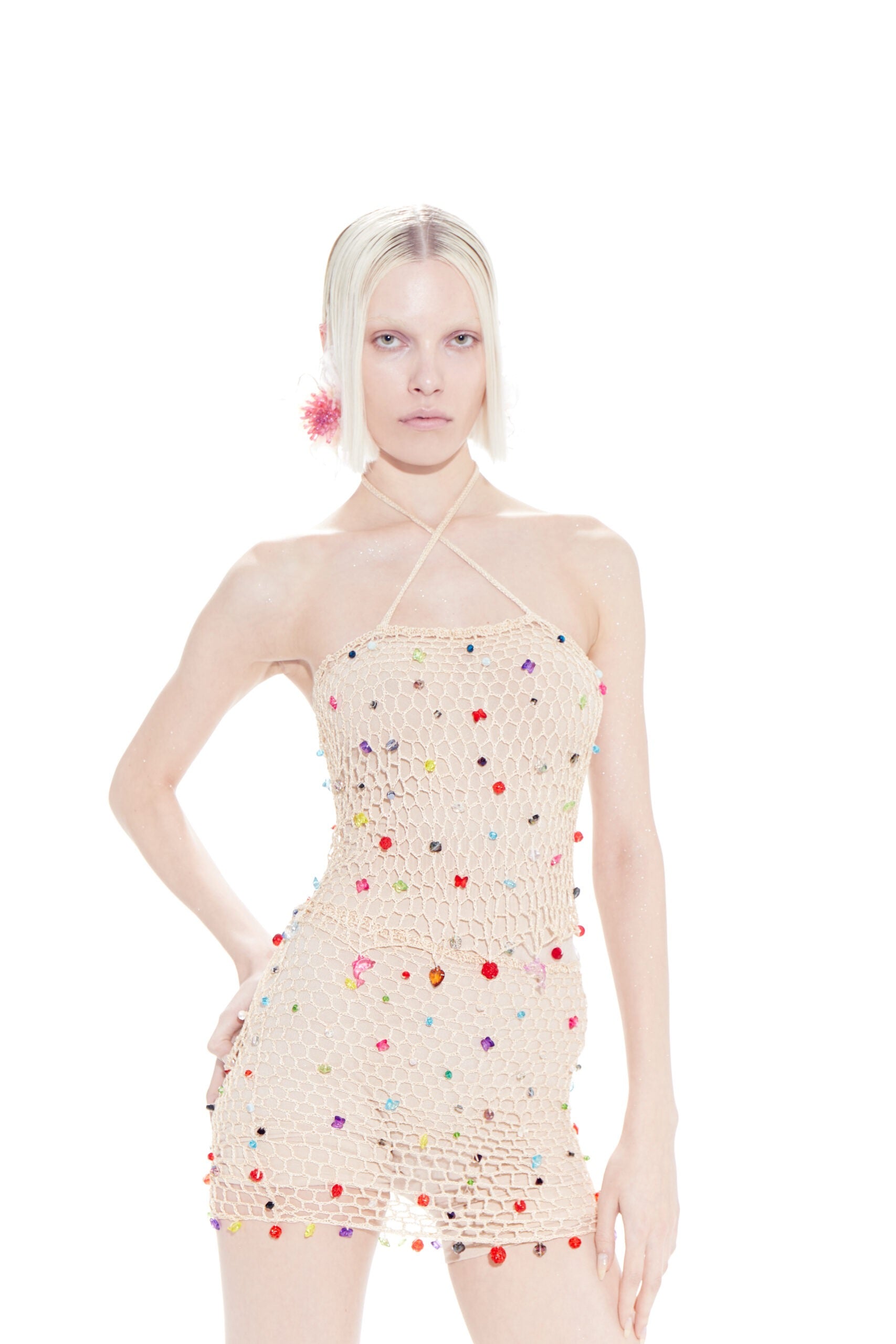 Mesh knit criss cross top decorated with multicolored 3D appliques Mesh knit micro-skirt decorated with multicolored 3D appliques