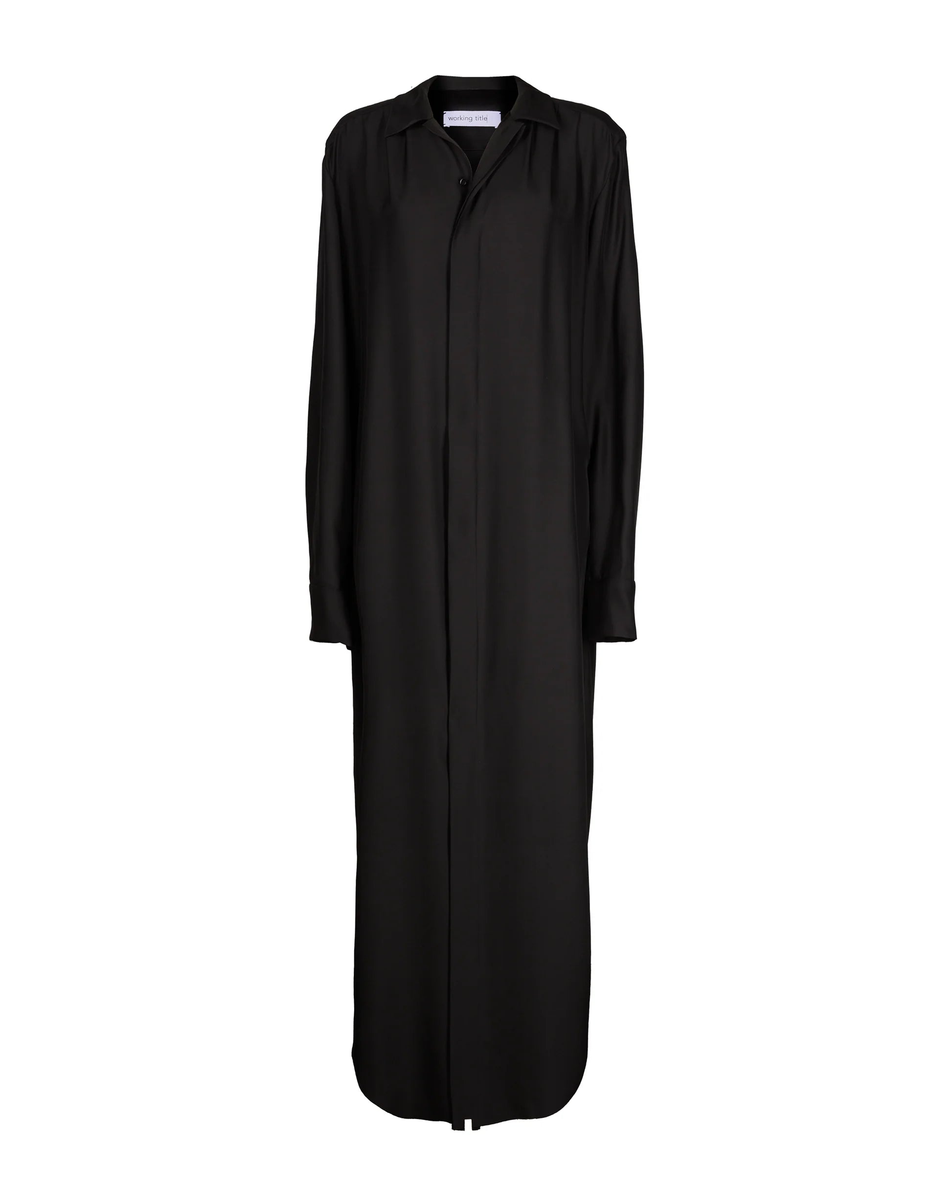 Elevate your wardrobe with our Saint Blouse Dress, tailored for those who appreciate timeless style paired with modern comfort. This sophisticated piece is crafted from pure, luxurious Italian silk. Ideal for those seeking a sophisticated yet comfortable garment. Its design features a relaxed, ankle-length silhouette that gracefully flows and flatters any body type. Detailed with a classic shirt collar and buttoned front, it strikes a balance between casual elegance and formal wear. The versatile black hue enhances its sleek and versatile appeal, making it perfect for any occasion from office wear to evening gatherings. Pair it with minimalist accessories for a polished look or dress it down with casual footwear for a more relaxed ensemble. This dress is not just a piece of clothing; it's an investment in enduring style.
