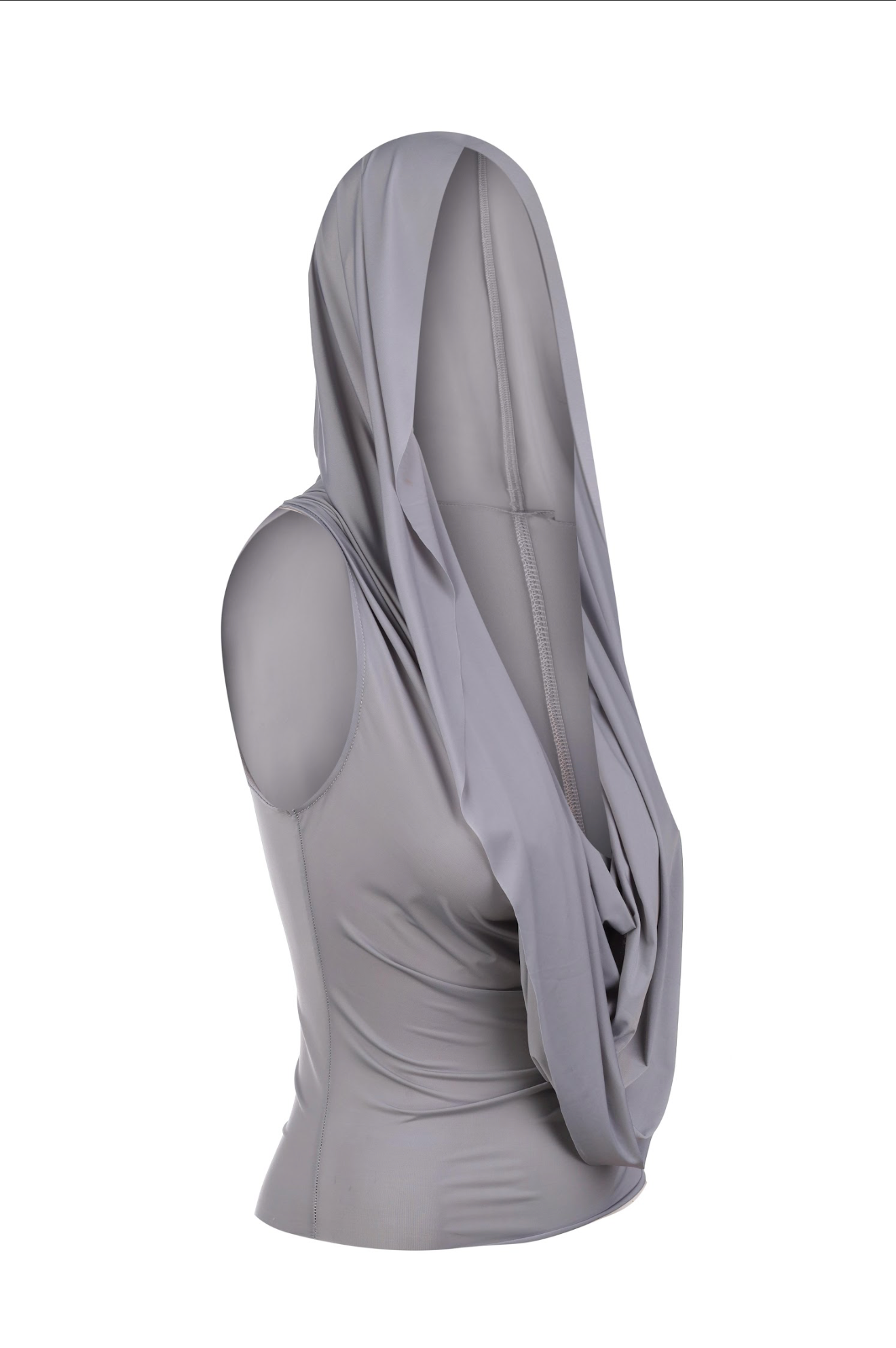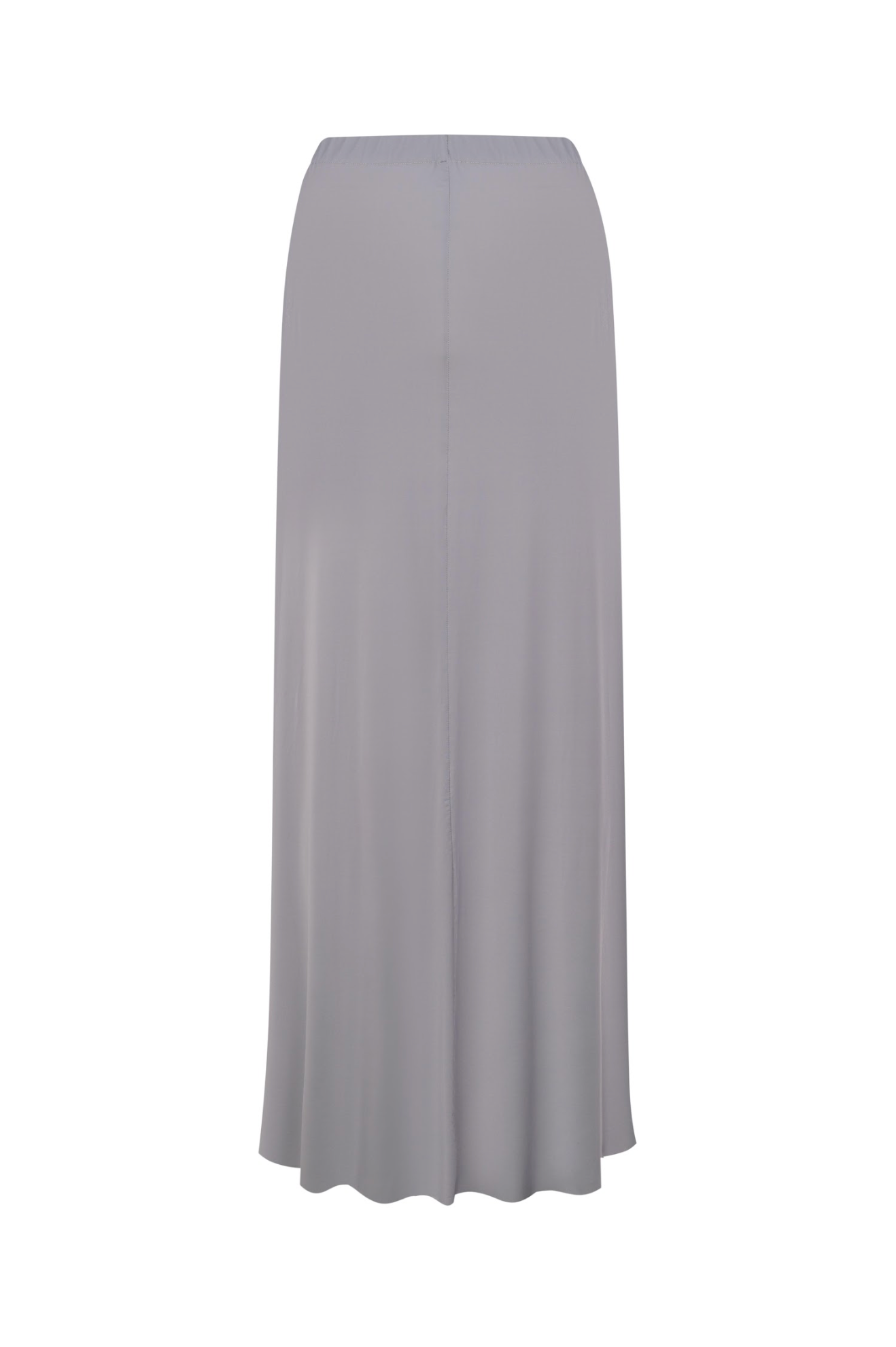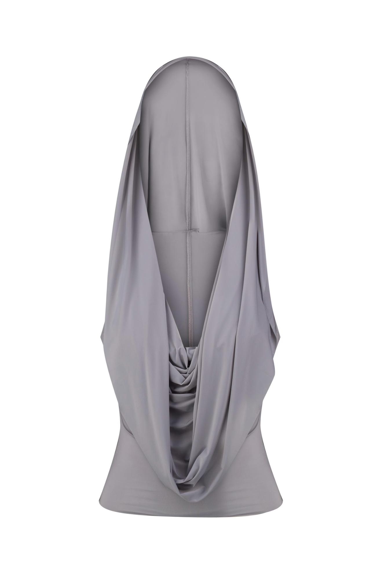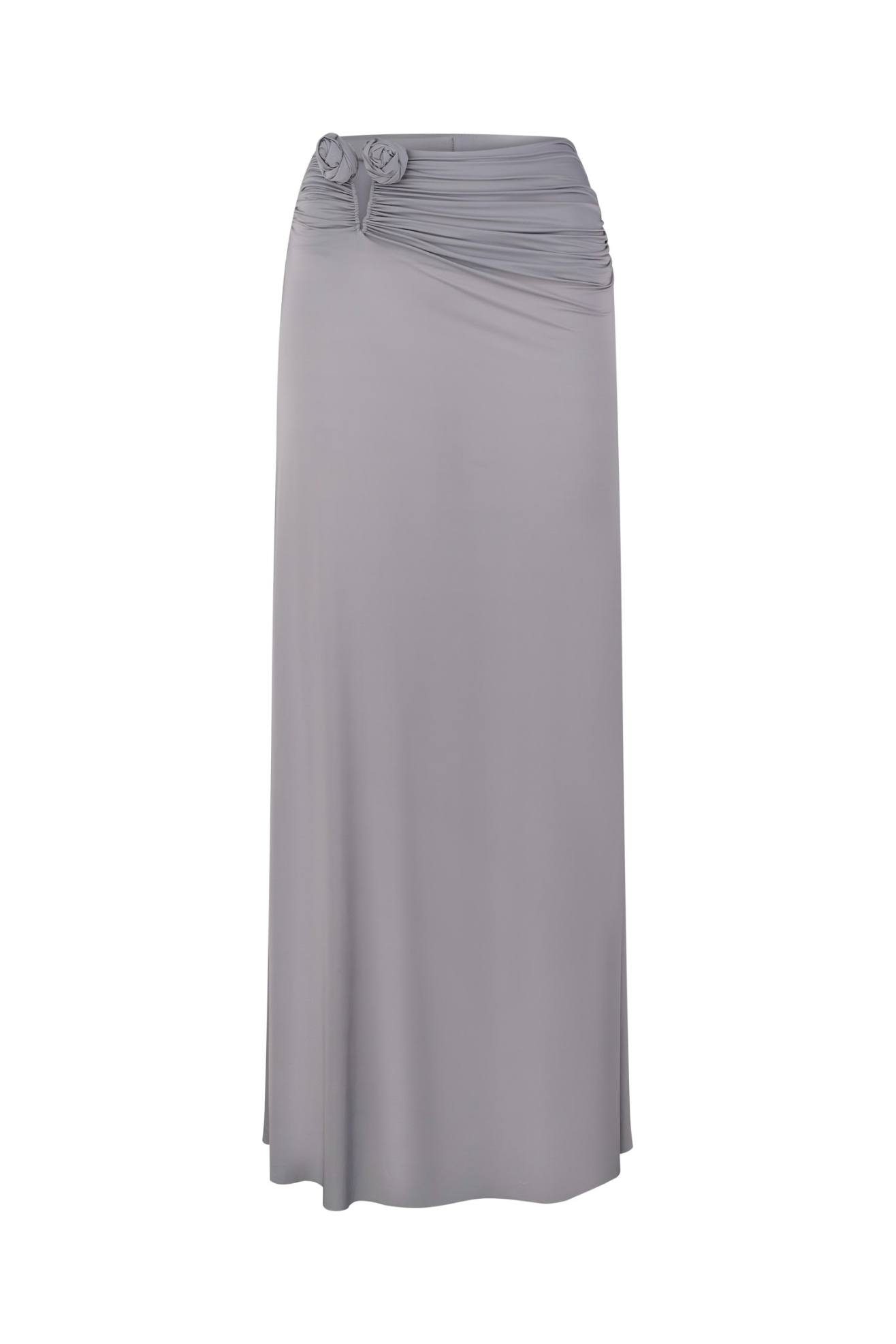 The cropped top features a deep neck cut, a soft hood that elegantly drapes at the back, and a ruched front detail that enhances its free flowing fit. The matching flowing maxi skirt features a draped top part, delicate floral embellishments, and intricate decorative elements that add texture and charm.