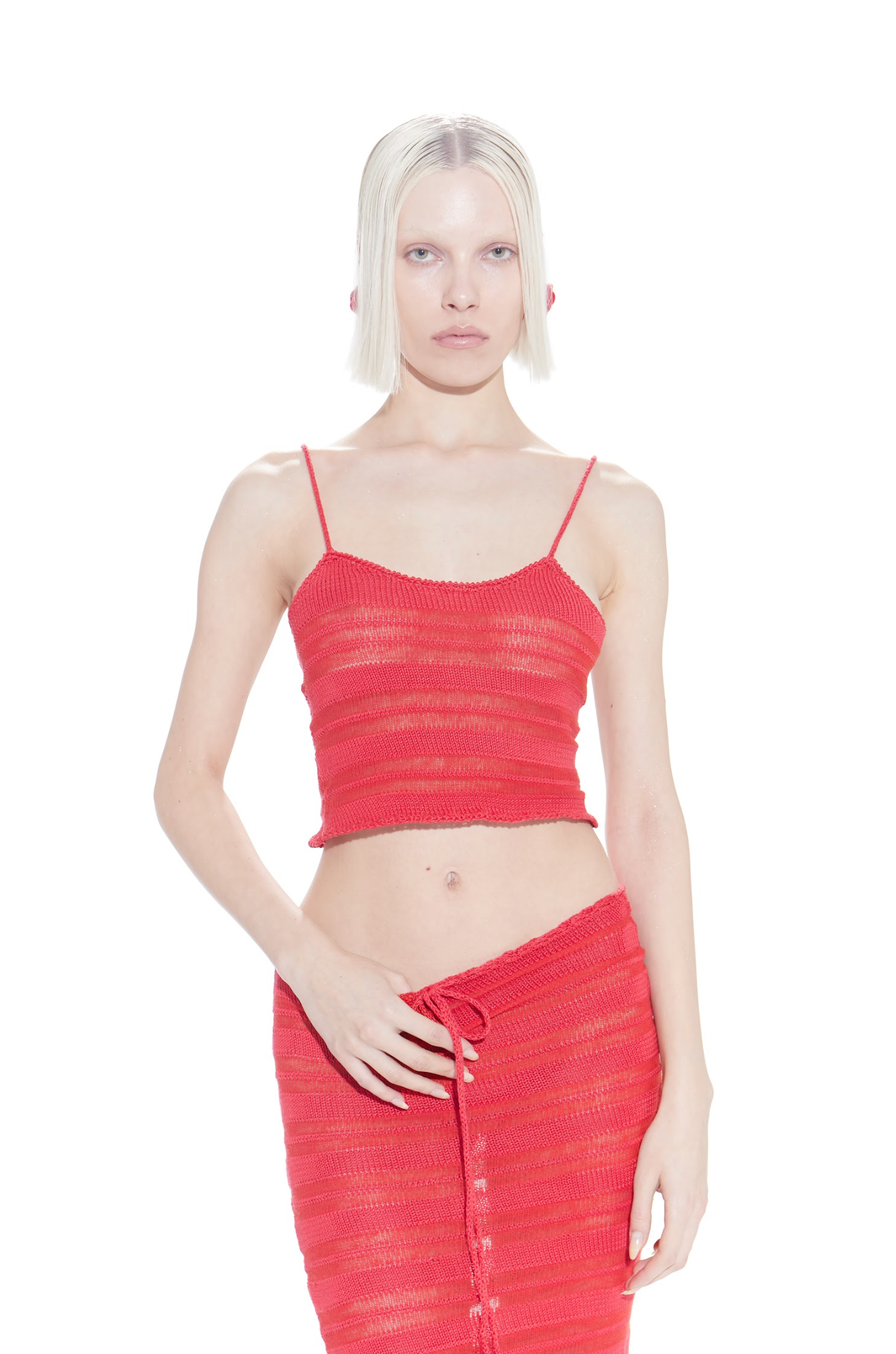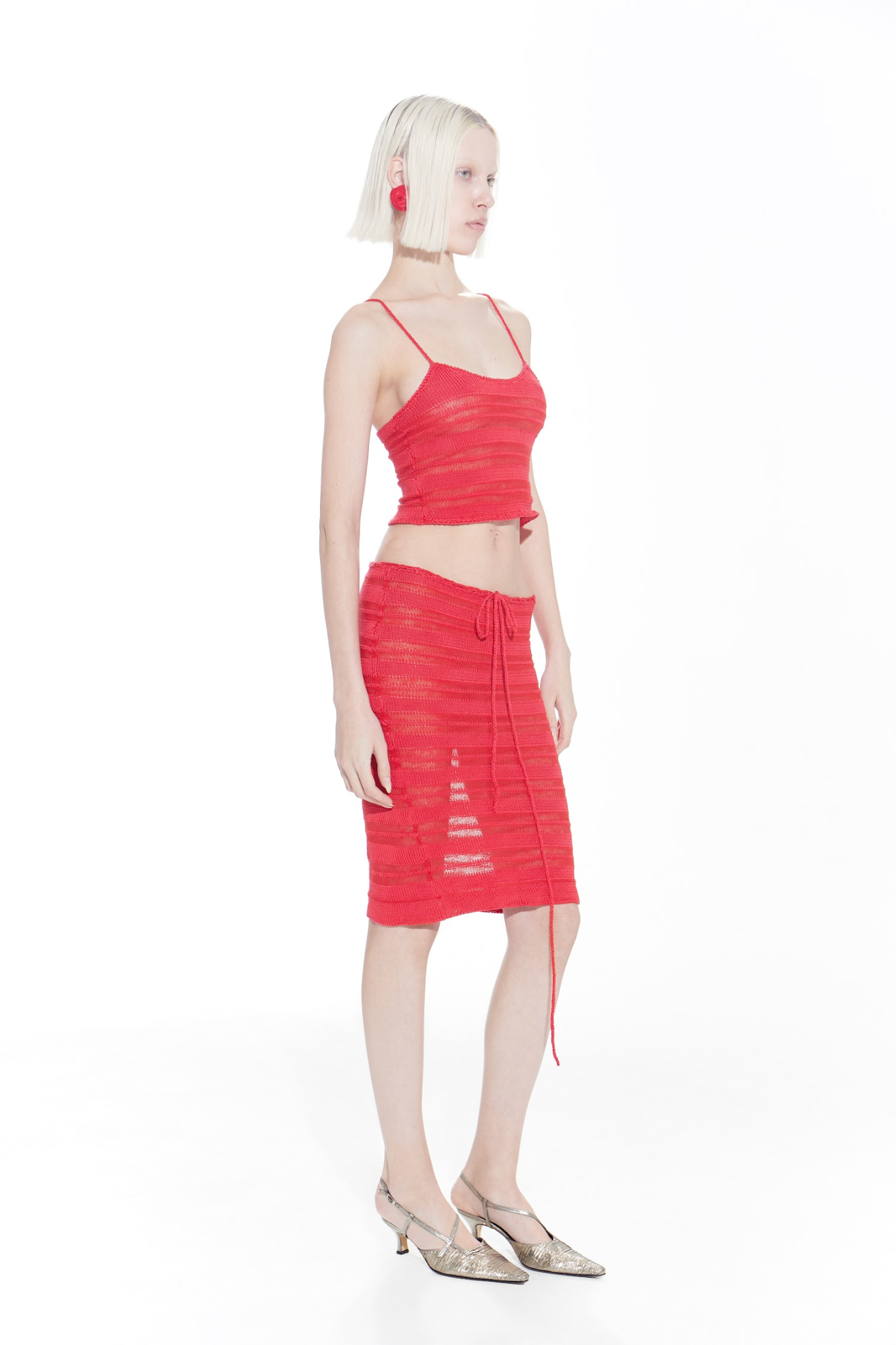 Shoulder strap knit see-through topSee-through low-waist knit skirt with drawstring