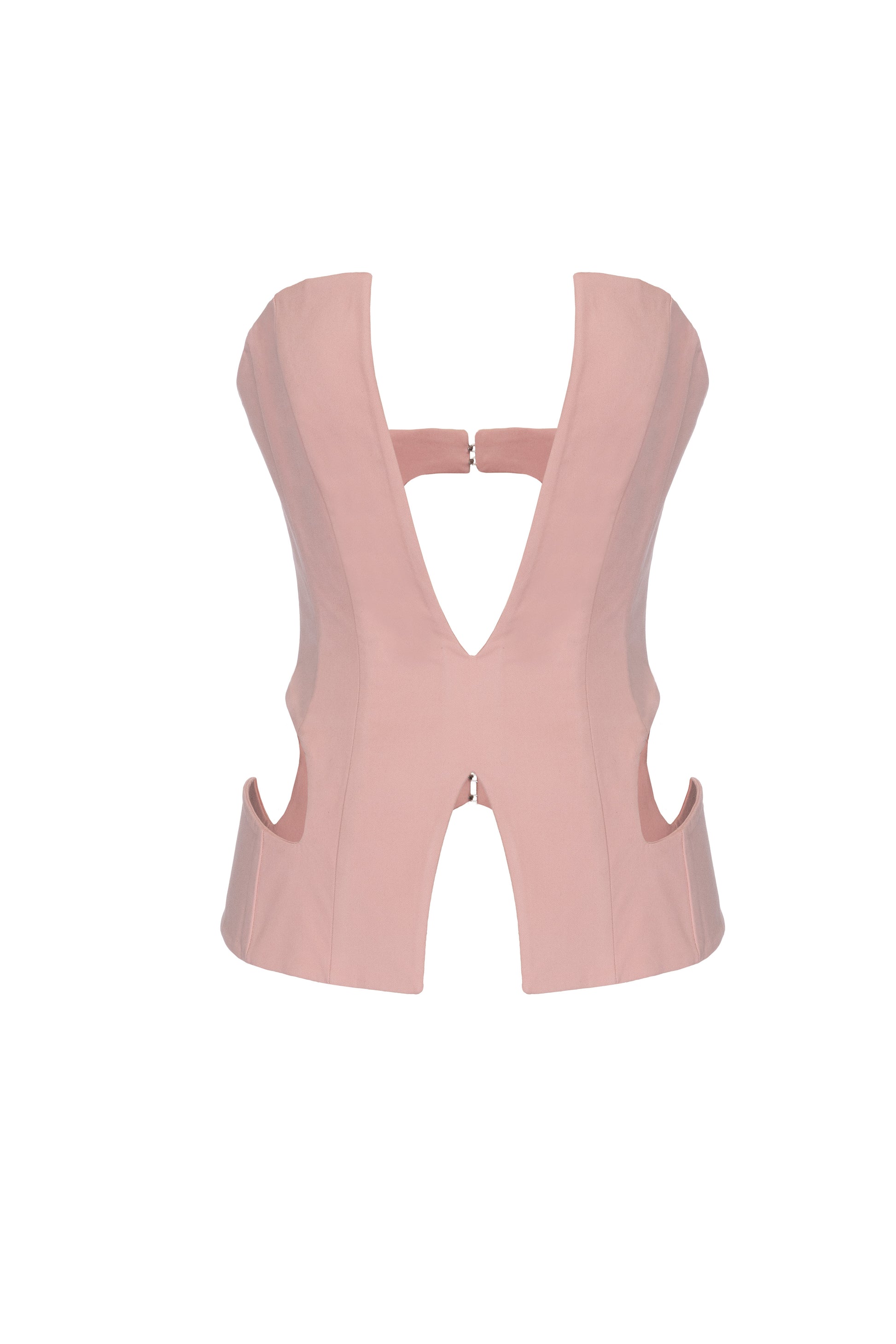 A pink corset with distinct cutouts at the chest, back, and hips. Hook fastenings run along the upper and lower back.