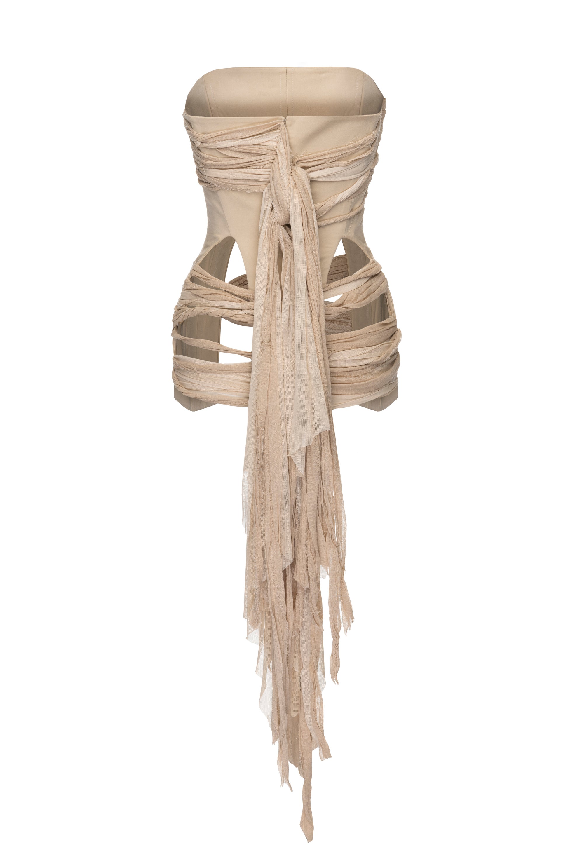 A corset-inspired fitted top featuring bandage-style detailing across the chest and hips, with layered fabric straps forming a soft train at the back. Symmetric cutouts embellish the hips.